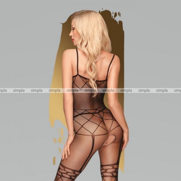 Кетсьют (боди-комбинезон) в мелкую сетку с оригинальным рисунком, подчеркивающим достоинства фигуры и скрывающим ее недостатки.