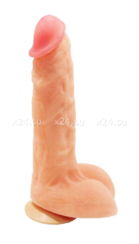 Реалистичный фаллоимитатор телесного цвета на присоске с мошонкой и ярко выраженной головкой. Рельефный, выполненный из «Киберкожи».