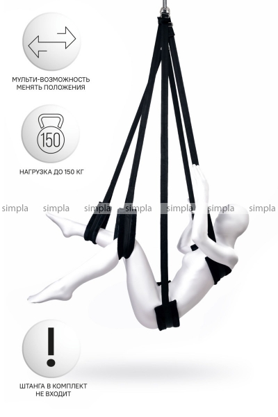 Ощущение полета! Расширенные возможности! Абсолютно новые впечатления! Секс-качели – аксессуар для тех, кто действительно любит секс во всех его проявлениях. Благодаря им вы сможете отдаться страсти, и в прямом смысле слова оторваться от земли. Все ремни регулируются, давая возможность бесконечно менять позы. Сидя, лежа, лицом или спиной к партнеру. Мягкие плюшевые подушки-опоры нежно обхватывают и поддерживают тело в любом положении. Тестируйте новые позы, добавляйте экстрима, варьируйте положение тела для собственного удовольствия, и наслаждайтесь парением! Выдерживает вес до 150 кг. Внимание! Штанга для подвешивания в комплект не входит!