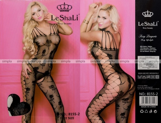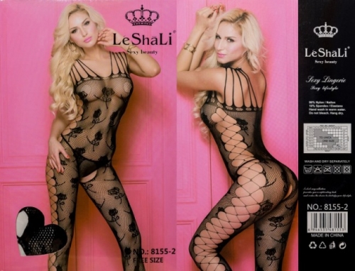 Невероятно сексуальный комбинезон-кэтсюит LeShaLi изготовлен из красивой сетчатой материи, украшенной цветочными узорами. Модель отличается наличием красивых фигурных вырезов на боках, имитирующих шнуровку и вырезом в интимной зоне, благодаря чему дама может заниматься сексом не снимая белья. Фиксация на плечах обеспечивается пятью тонкими бретелями с каждой стороны.