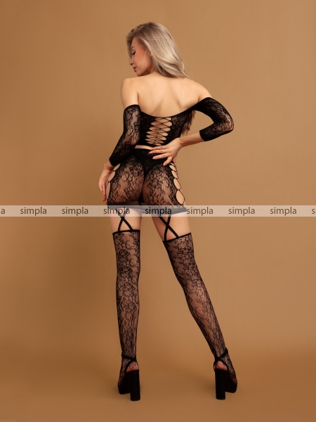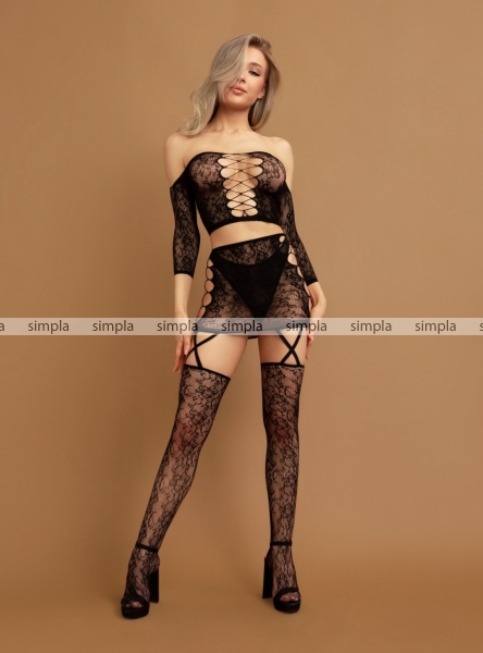 Данная модель - уникальный симбиоз желаний. Тот вариант, когда хочется максимальной экстравагантности, приправленной щепоткой кокетства, и без единого намёка на вульгарность. Нежное кружево деликатно черного цвета облегает каждый соблазнительный изгиб тела, единая концепция чулок и юбки интригует, разжигая интерес и желание прикоснуться. Узоры и сетка верхней части костюма, подобно вечернему платью, позволяют демонстрировать изящество линии ключиц, и красоту шеи. Этот комплект так же дарит возможность ношения по отдельности как топа, так и чулок с юбкой, сочетая их с другими предметами одежды и аксессуарами. Особый состав и плетение не сковывает движения и не перетягивает тело, а значит вам будет комфортно! Подходит для размеров от S до XXL.