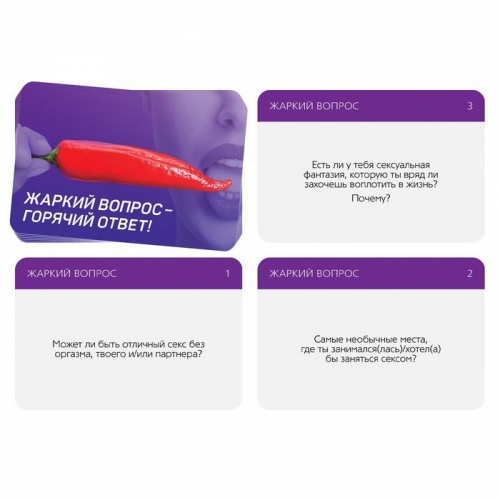 Жаркий вопрос — горячий ответ! Настало время узнать друг друга гораздо глубже! По очереди вытягивайте карты из колоды, отвечайте на вопросы и открывайте партнёра с неожиданной и очень возбуждающей стороны!