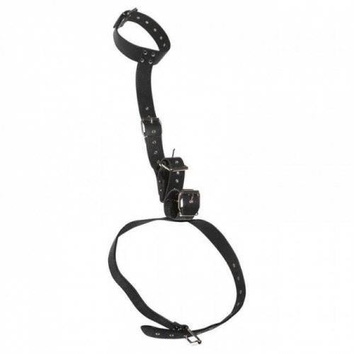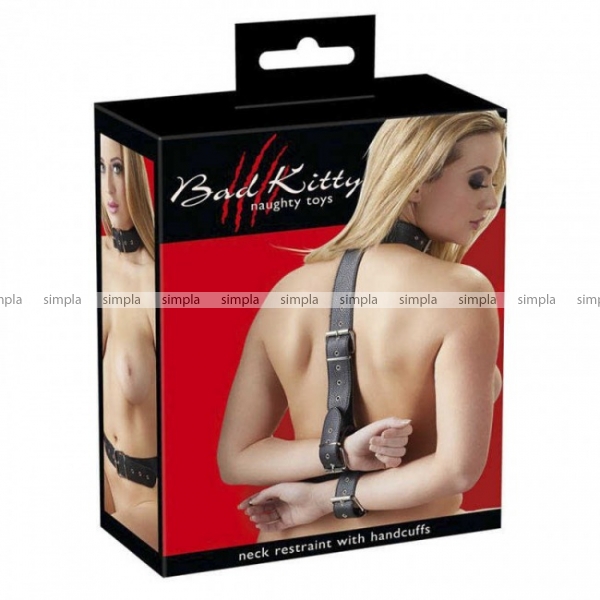 Просто великолепный аксессуар для фиксации в стиле БДСМ. Аксессуар называется Bad Kitty Neck and Hand Restraints и представляет собой систему ремешков из высококачественного полиуретана, имитирующего собой натуральную кожу. Система удерживает шею и запястья за спиной таким образом, что они располагаются вплотную к спине одно над другим. Длина центрального ремня регулируется, поэтому фиксация может быть различной – свободной или достаточно жесткой. Аксессуар снабжен отличной металлической фурнитурой и дополнительным усилением при помощи заклепок.