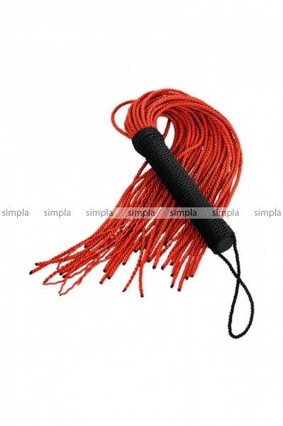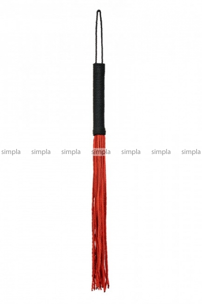 Веревочный флоггер с красными хвостами и черной плетеной ручкой мягко разогревает кожу и готовит к более серьезным воздействиям.