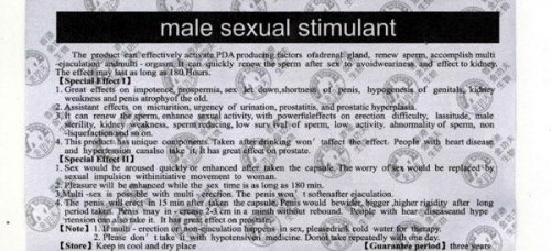Состав: панты оленя, яички яка, женьшень, шафран, эпимедиум, китайский гусеничный гриб, лотос, и др.