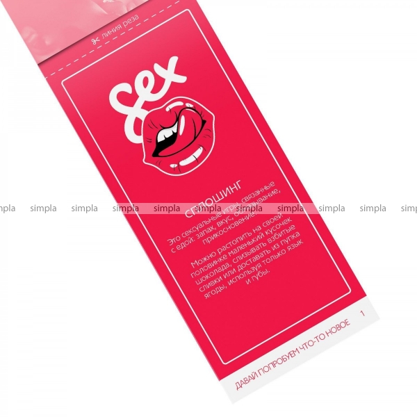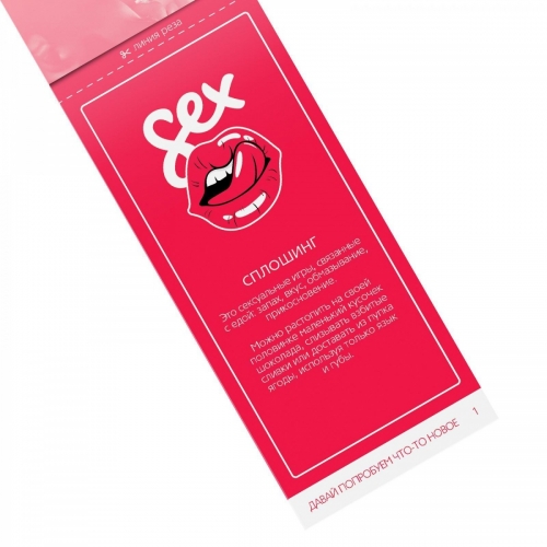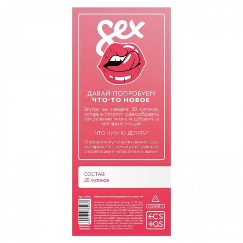 Как разнообразить сексуальную жизнь и добавить в неё ещё больше ярких эмоций? В этом наборе вас ждёт 20 способов вернуть в отношения страсть, азарт и испытать новые ощущения. Как использовать купоны? Просто разрезайте купоны по пунктирной линии, выбирайте то, чем хотите заняться сегодня, и воплощайте написанное в жизнь! Дарите друг другу любовь и наслаждение!
