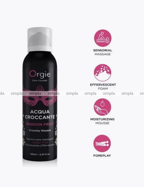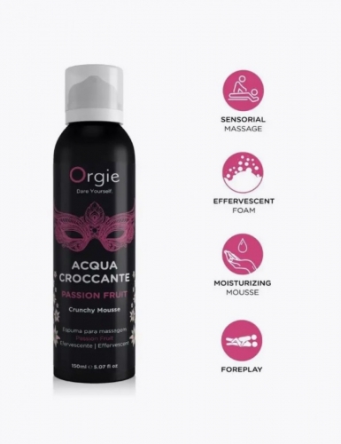 Acqua Croccante - это увлажняющая и шипучая массажная пена с восхитительным ароматом, которая при нанесении на кожу и под легким нажимом ваших рук вызывает шипение, взрыв мелких пузырьков, которые находятся в пене, доставляя уникальные, супер возбуждающие и приятные ощущения. Массажная пенка внесет разнообразие в ощущениях от массажа, добавит мягкое ощущение холодка, которое на контрасте с горячим телом подарит незабываемые ощущения. Представьте, как тысячи игривых пузырьков танцуют на вашей коже, лопаясь, словно льдинки в бокале клубничного коктейля на пляже Рио…Именно такие впечатления дарит шипучая увлажняющая пена для чувственного массажа Orgie Acqua Croccante. С ее помощью можно превратить расслабляющий массаж в волнующую интимную игру или в эксперимент, который откроет новые ощущения — просто встряхните баллончик и нанесите пену на себя или партнера. Массажная пенка внесет разнообразие в ощущениях от массажа, добавит мягкое ощущение холодка, которое на контрасте с горячим телом подарит незабываемые ощущения.