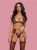 Комплект эротического белья, состоящего из кружевного бюстгальтера с розовыми декоративными бантиками из атласной ленты, элегантных миниатюрных стринг и пояса для чулок.