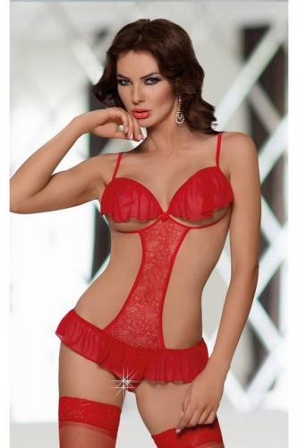 Боди выполнено из ажурного материала, имеет открытые чашечки на которые нежно спускается полупрозрачная оборка. Между грудей маленький нарядный бантик со стразинкой. Боди сзади на завязках. На трусики с разрезом нежно спускается полупрозрачная оборка.