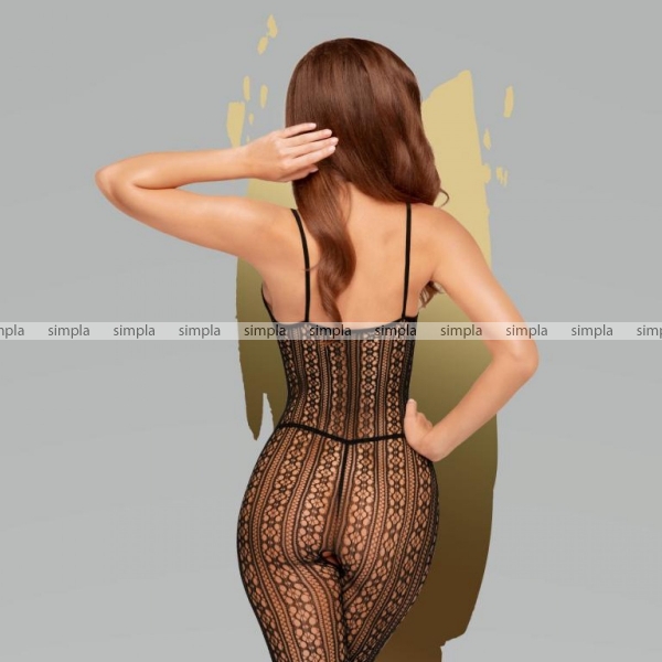 Кетсьют (боди-комбинезон) в мелкую сетку с оригинальным рисунком, подчеркивающим достоинства фигуры и скрывающим ее недостатки. В самом интересном месте имеется разрез для страстной ночи-любви. Стринги в комплект не входят.