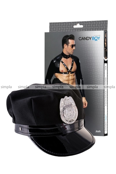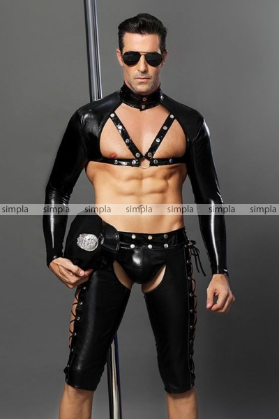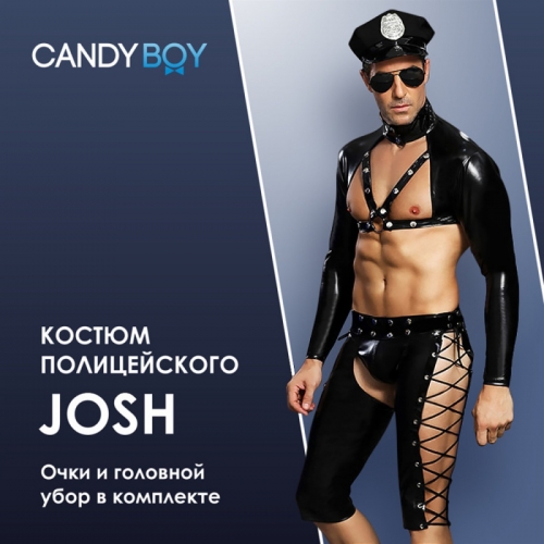 Костюм полицейского Candy Boy Josh, выполненный из ткани wetlook с лаковыми вставками и серебристыми кнопками – выбор смелых и очень уверенных в себе мужчин! Обтягивающий топ-рашгард c воротником-стойкой на кнопках подчеркивает рельеф мужского торса. Wetlook трусы–чапсы (современное прочтение ковбойской одежды) шнуруются по бокам, на бедрах фиксируются регулируемыми кнопками. Открывающийся вид сзади просто незабываем! Настоящие затемненные очки, головной убор с надписью «City Police» дополняют образ.