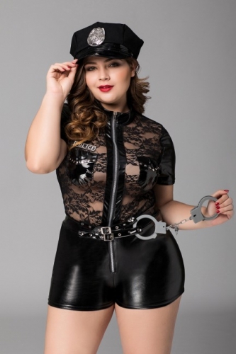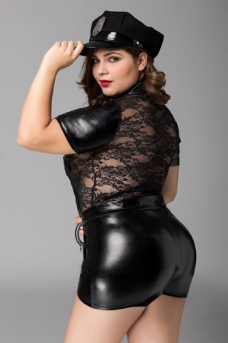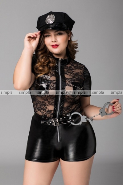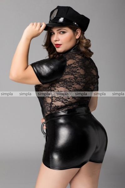 Игровой костюм полицейского для девушек с большими размерами Porsche от бренда Candy Girl. Чёрный комбинезон из сочетания тканей: wetlook и прозрачного эластичного кружева. Костюм выгодно подчеркивает фигуру. Воротник-стойка, непрозрачные короткие рукава и кепка полицейского со значком добавляют образу строгости. Лаковые вставки прикрывают самые интимные места груди, акцентируют внимание на талии. Молния без острых краев.