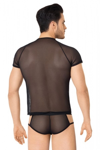 Экстравагантный комплект для смелых мужчин. Футболка и шорты выполнены из крупной эластичной сетки. Задняя часть трусов выполнена из мягкой мелкой сеточки, спереди вставка из такой же сеточки.