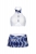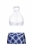 Костюм школьницы. Топ из эластичной сетки декорирован спереди непрозрачной вставкой и пуговицами, на застежке "крюк-петля" сзади. Воротник-стойка на "липучке", украшен контрастным бантом. Юбка, Т-стринги и бант выполнены из клетчатого трикотажа.