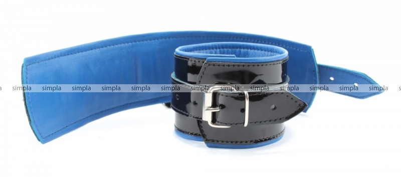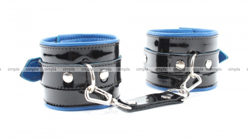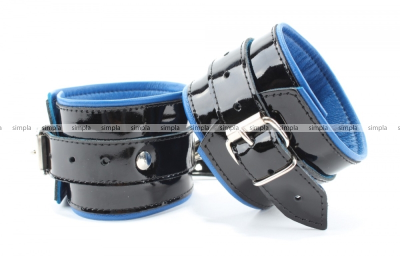 Наручники из натуральной кожи с лаковым покрытием. Подклад выполнен из нежной кожи контрастного синего цвета. Сварная металлическая фурнитура и цельный хлястик для надежной фиксации. Надёжно фиксируются на запястьях с помощью ремешков. Размер универсальный, регулируемый.