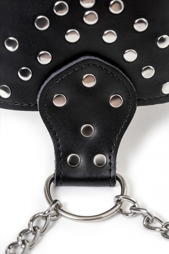 Этот стильный чёрный ошейник из натуральной кожи с блестящими заклёпками соединён 50-сантиметровой металлической цепью с мягкими кожаными наручниками. Он настолько привлекателен и удобен, что примерив ошейник однажды, не захочется отказаться от его использования в дальнейшем.