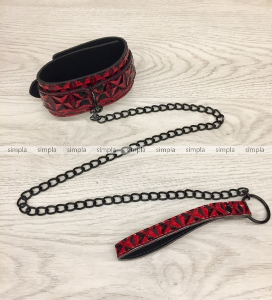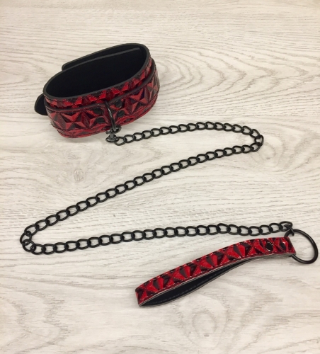Ошейник из лакированного материала с 3d-эффектом, с внутренней стороны расположен бархатистый материал, предотвращающий натирание. Имеется поводок, который гарантирует, что невольник безропотно последует за своим господином.