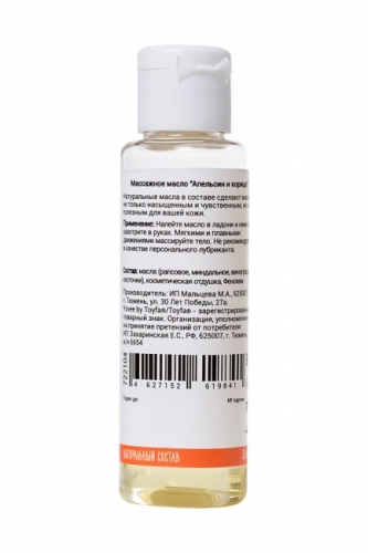 Натуральные масла в составе сделают массаж не только насыщенным и чувственным, но и полезным для вашей кожи. Отлично скользит и смывается водой. Бодрый и пряный аромат апельсина с корицей с лёгкостью расслабит и подготовит вас к чувственному массажу. Идея для свидания: В серый и прохладный день хочется взбодриться ароматами апельсина. Корица добавит пряных ноток и настроит на интимный лад. Ароматный массаж точно согреет вас и пробудит страстные чувства. Сделайте массаж своим обнажённым телом — так он станет ещё более интимным и чувственным. Такое свидание останется в памяти надолго! Применение: Налейте масло в ладони и немного разотрите в руках. Мягкими и плавными движениями массируйте тело. Не рекомендуется в качестве персонального лубриканта.