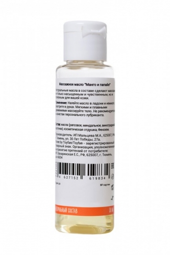 Натуральные масла в составе сделают массаж не только насыщенным и чувственным, но и полезным для вашей кожи. Отлично скользит и смывается водой. Пикантный и тропический аромат манго и папайи с лёгкостью расслабит и подготовит вас к чувственному массажу. Идея для свидания: Устройте для своей половинки экзотическое свидание. Дополнением к напиткам и фруктам станет чувственный массаж с ароматом манго и папайи. Сделайте массаж своим обнажённым телом — так он станет ещё более интимным и чувственным. Такое свидание останется в памяти надолго! Применение: Налейте масло в ладони и немного разотрите в руках. Мягкими и плавными движениями массируйте тело. Не рекомендуется в качестве персонального лубриканта.