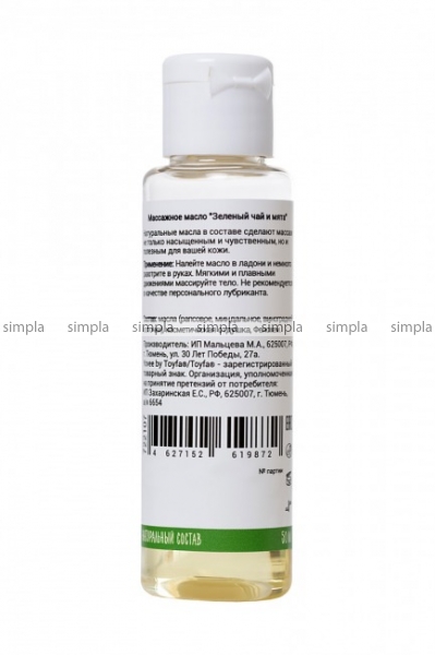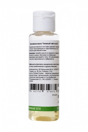 Натуральные масла в составе сделают массаж не только насыщенным и чувственным, но и полезным для вашей кожи. Отлично скользит и смывается водой. Аромат зелёного чая и мяты с лёгкостью расслабит и подготовит вас к чувственному массажу. Подготовьтесь к свиданию: После приёма расслабляющей ванны побалуйте себя ароматным массажем. Налейте масло в ладони и лёгкими массажными движениями массируйте своё тело. Освежающий аромат и натуральные масла в составе сделают вашу кожу приятной и мягкой. Применение: Налейте масло в ладони и немного разотрите в руках. Мягкими и плавными движениями массируйте тело. Не рекомендуется в качестве персонального лубриканта.