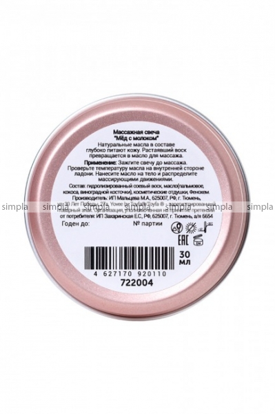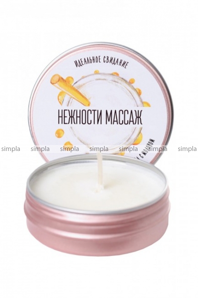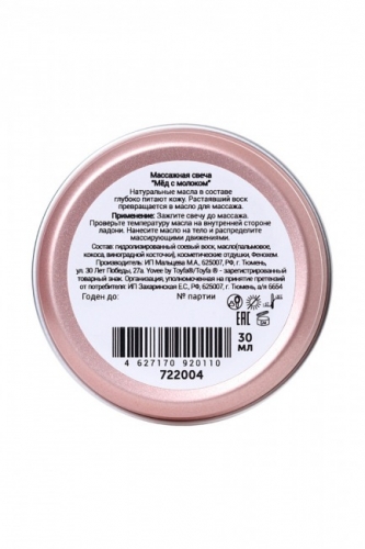 Натуральные масла в составе глубоко питают и увлажняют кожу. Растаявший воск превращается в масло для массажа. Свеча станет идеальным аксессуаром для романтического свидания. Подготовьтесь к свиданию: После приятной и расслабляющей ванны зажгите свечу. Насладитесь нежными ароматами мёда с молоком, которые наполнят в. Предложите партнеру расслабиться в ожидании массажа. Погасите свечу и немного подождите, пока масло остынет. Лейте масло вдоль спины медленно, а затем начните с лёгких массирующих движений. Сделайте массаж своим обнаженным телом — так он станет ещё более интимным и чувственным. Такое свидание останется в памяти надолго! Свеча подарит незабываемые ощущения, после которых вам гарантированы нежные и мягкие прикосновения! Применение: Зажгите свечу до массажа. Когда образуется достаточное количество масла, погасите её. Проверьте температуру масла на внутренней стороне ладони, при необходимости дайте маслу немного остыть. Нанесите разогретое масло на тело и массирующими движениями распределите по телу.