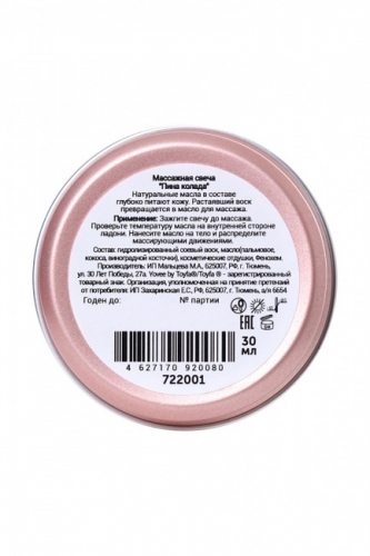 Натуральные масла в составе глубоко питают и увлажняют кожу. Растаявший воск превращается в масло для массажа. Свеча станет идеальным аксессуаром для романтического свидания. Идея для свидания: Приготовьте пару коктейлей Пина колада и зажгите массажную свечу. Предложите партнеру расслабиться в ожидании массажа. Погасите свечу и немного подождите, пока масло остынет. Лейте масло вдоль спины медленно, а затем начните с лёгких массирующих движений. Сделайте массаж своим обнаженным телом — так он станет ещё более интимным и чувственным. Такое свидание останется в памяти надолго! Свеча подарит незабываемые ощущения, после которых вам гарантированы нежные и мягкие прикосновения! Применение: Зажгите свечу до массажа. Когда образуется достаточное количество масла, погасите её. Проверьте температуру масла на внутренней стороне ладони, при необходимости дайте маслу немного остыть. Нанесите разогретое масло на тело и массирующими движениями распределите по телу. Наслаждайтесь ароматом и бархатной кожей!