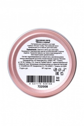Натуральные масла в составе глубоко питают и увлажняют кожу. Растаявший воск превращается в масло для массажа. Свеча поможет подготовить вашу кожу к свиданию. Подготовьтесь к свиданию: После приятной и расслабляющей ванны зажгите свечу. Насладитесь пряными ароматами яблока с корицей, которые наполнят вашу комнату. Зажгите свечу и немного подождите, пока масло остынет. Нанесите масло на всё тело и сделайте лёгкий, расслабляющий массаж. После питательных масел ваша кожа будет мягкой и нежной. Свеча подарит незабываемые ощущения, после которых вам гарантированы нежные и мягкие прикосновения! Применение: Зажгите свечу до массажа. Когда образуется достаточно количество масла, потушите её. Проверьте температуру масла на внутренней стороне ладони, при необходимости дайте маслу немного остыть. Нанесите разогретое масло на тело и массирующими движениями распределите по телу. Наслаждайтесь ароматом и бархатной кожей!
