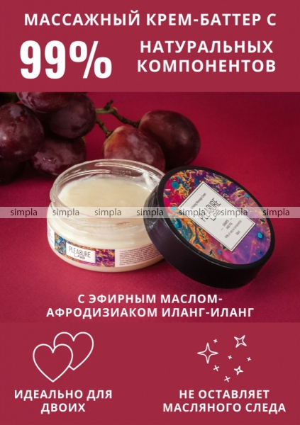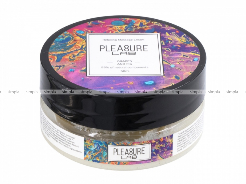 Pleasure Lab Relaxing с ароматом винограда и инжира, а также эфирным маслом-афродизиаком иланг-иланг способен не только создать волнующую, романтическую атмосферу, но и нежно расслабить тело партнера. Способ применения: разотрите небольшое количество крема в ладонях и медленно начните продвигаться массирующими движениями от ступней к спине и плечам партнера. Массажный крем подходит для самомассажа, а также выравнивает и увлажняет рельеф кожного покрова за счет специальных активных ингредиентов и массирующих гранул, не оставляя маслянистой пленки. Состав: масло ши (карите), масло кокосовое, масло оливковое, масло макадамии, масло виноградных косточек, парфюмерная композиция, масло семян инжира, эфирное масло иланг-иланг, СК-СО2 экстракты (розмарин, малина , яблоко ,виноград, гранат, калина), натуральный антиоксидант (токоферол (смесь), бета-ситостерол, сквален), витамин Е.