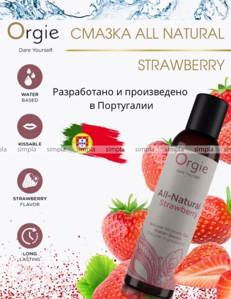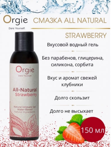 All-Natural Strawberry — натуральная смазка на водной основе со вкусом и ароматом клубники. Гладкий и шелковистый интимный гель восхитит своим неотразимым сочетанием вкуса тех, кто хочет придать изюминку интимным моментам с партнером или наедине. Смазка состоит из натуральных ингредиентов, загустителя из растительной целлюлозы и не содержит парабенов, силикона, жидкого парафина, глицерина и сорбита. Не липкая, легко смывается водой. Можно использовать при оральных играх.
