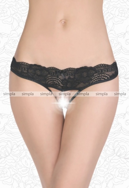 Миниатюрные трусики черного цвета с доступом. Изготовлены из нежнейшего кружева и декорированы бантиками и полосочкой жемчуга посередине.