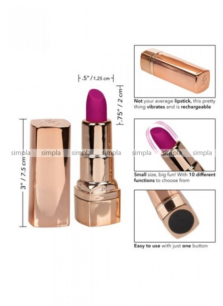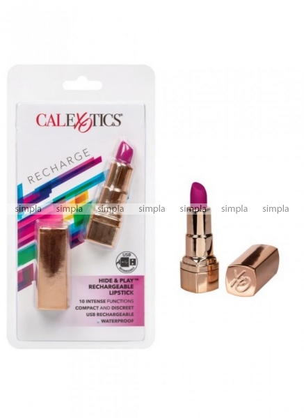 Hide & Play Rechargeable Lipstick – перезаряжаемый мульти скоростной миниатюрный вибромассажер, выполненный в виде помады. Корпус изготовлен из гладкого, не содержащего фталатов АБС-пластика, покрытого золотым полеуретановым покрытием, а головка выполнена из бархатистого силикона. Бесшумный двигатель вибратора обеспечивает 10 различных функций мощной вибрации, пульсации и эскалации. Компактность, удобство и нейтральная форма делают этот вибромассажер идеальным спутником везде, куда бы ты ни отправилась. Применение: Наклонный наконечник предназначен для точечной и клиторальной стимуляции. Игрушка имеет удобное управление одной кнопкой. Чтобы включить или выключить игрушку, необходимо нажать и в течение трех секунд удерживать кнопку питания. Вибромассажер заряжается через USB и может быть подключен практически в любом месте, просто подсоедините идущий в комплекте шнур к совместимому порту компьютера или USB-адаптера (приобретается отдельно), а противоположный конец со штекером к игрушке. Полная зарядка занимает 2 часа, ее достаточно для беспрерывной работы до 2 часов. Хранение: Очищать игрушку желательно до и после использования. Можно помыть в теплой воде с мылом или воспользоваться специализированным чистящим средством. Перед хранением вибромассажер необходимо хорошо просушить. Желательно хранить отдельно от других силиконовых изделий.
