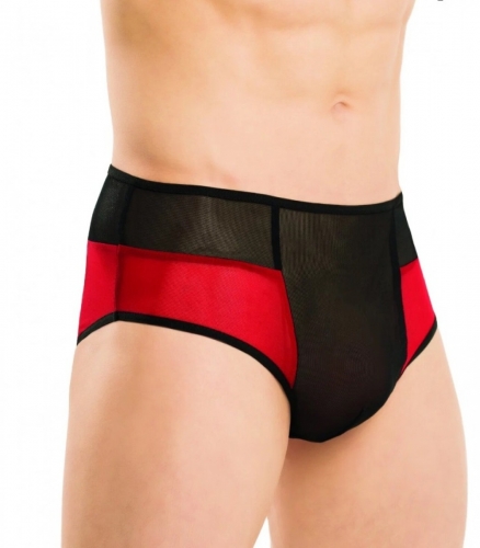 Полупрозрачные трусы сделаны из эластичной мелкой сеточки двух цветов. Красно-черный вариант трусов с открытой областью ягодиц - для смелый ярких мужчин!