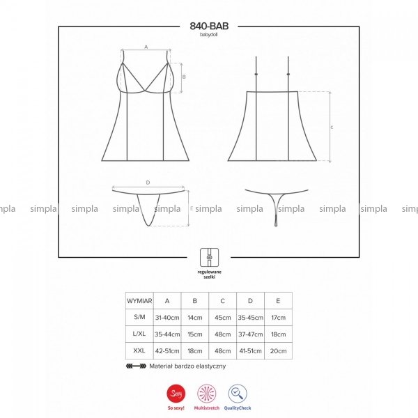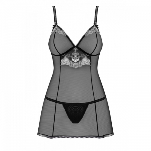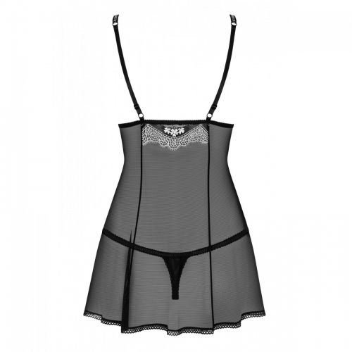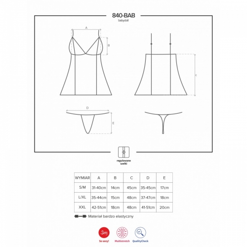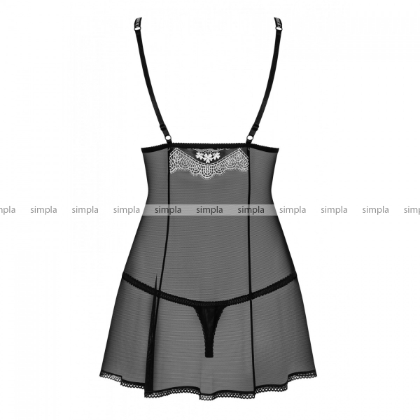 Сорочка бебидолл с мягким лифом без косточек. Тонкие бретельки регулируются по длине. Сорочка комплектуется трусиками стрингами. Лиф и спинка сорочки декорированы белым кружевом и вышивкой.