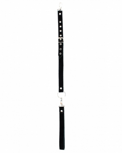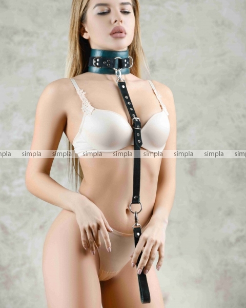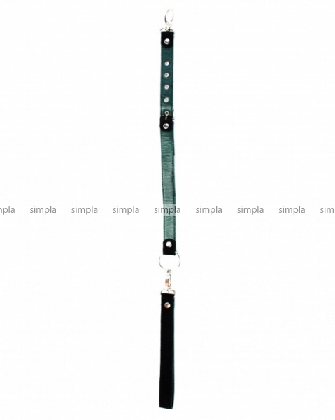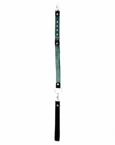 Поводок с одной стороны выполнен из натуральной кожи изумрудного цвета, с другой стороны из черной замши. Длина изделия регулируется металлической пряжкой, карабины и кольцо надежно фиксируют в подчинении, обеспечивая погружение в сладкий мир ограничений.