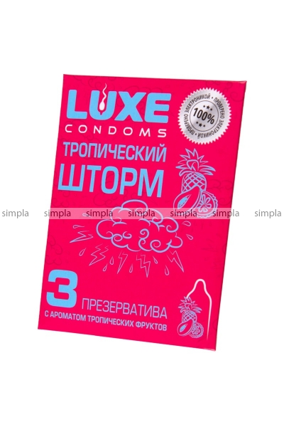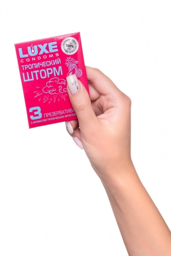 Удивите партнера и порадуйте себя новыми ощущениями! Вкусное и качественное удовольствие с презервативами LUXE с ароматом тропических фруктов Тропический шторм. Три латексных презерватива с накопителем и смазкой в яркой фирменной упаковке. Гладкая поверхность и силиконовая смазка для качественного и длительного скольжения. Аромат тропических фруктов взбодрит и освежит ваши отношения! Наслаждаться процессом, не беспокоясь о безопасности, легко с презервативами LUXE Тропический шторм. Необычная упаковка с креативным дизайном и многообещающим названием также призвана сделать вашу близость незабываемой.