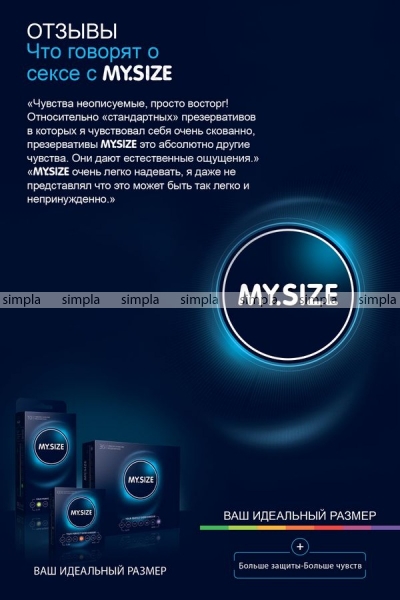 Если вы еще не знакомы с презервативами бренда MY.SIZE, значит, вы ничего не знаете о презервативах. Позвольте представить вам немецкие элитные презервативы MY.SIZE с сертификатами качества международных стандартов. Каждый мужчина уникален! Большинство имеет нестандартные формы и размеры. Несмотря на прочность и эластичность латекса, самой частой причиной разрыва и сползания презерватива является неправильно подобранный размер. MY.SIZE учел индивидуальность каждого мужчины и решил эту проблему, создав уникальный размерный ряд. MY.SIZE — это 7 размеров с идеальной посадкой от 47 до 69. Размерный номер означает половину длины окружности презерватива (ширину) в миллиметрах. Таким образом, идеальную посадку обеспечивает знание не длины, а окружности. Узнать свой размер можно двумя способами: измерить мерной лентой обхват эрегированного пениса и поделить результат на 2. открыть на смартфоне виртуальную линейку с помощью сайта mysize-condoms.ru. Наряду с широким размерным рядом и непревзойденным качеством у MY.SIZE много достоинств: Премиальное качество – чистый, натуральный латекс и гипоаллергенная силиконовая смазка Идеальные по размеру – больше безопасности, больше удовольствия, больше комфорта. Линейка и подробная инструкция в каждой коробке. Широкий размерный ряд – единственные в России презервативы, учитывающие индивидуальные анатомические особенности Упаковка 36 презервативов – выгодно и удобно. Не ограничивайте себя в удовольствии. Экологически безопасные и имеют маркер Vegan - в их изготовлении не используют продукты животного происхождения. Упаковка презервативов не содержит полиэтилен, а сами пачки биоразлагаемые. Длина 178 мм, диаметр 53 мм Количество в коробке – 36 шт. Производитель – R&S Consumer goods GmbH, Германия Единожды узнав свой размер, вы навсегда измените качество секса, забыв о дискомфорте во время полового акта. Только естественные и яркие ощущения!