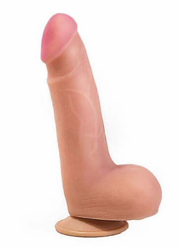 Фаллоимитатор на присоске имеет форму члена с ярко-выраженной головкой, рельефный, выполненный из сверхсовременного материала нового поколения, обладающий уникальными свойствами по пластичности, передающий эффект очень мягкой текстуры кожи.