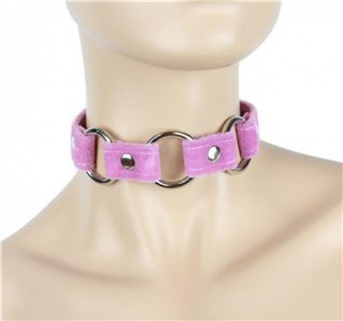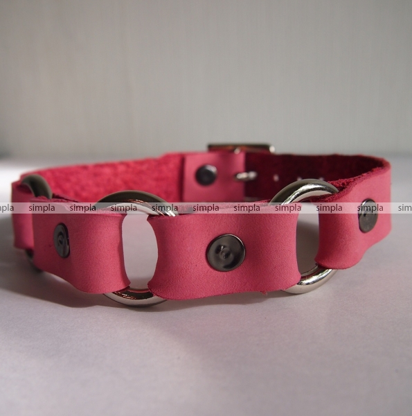 Чокер из мягкой розовой натуральной кожи, декорированный металлическими кольцами. Общая длина чокера 37 см, ширина 1,8 см.