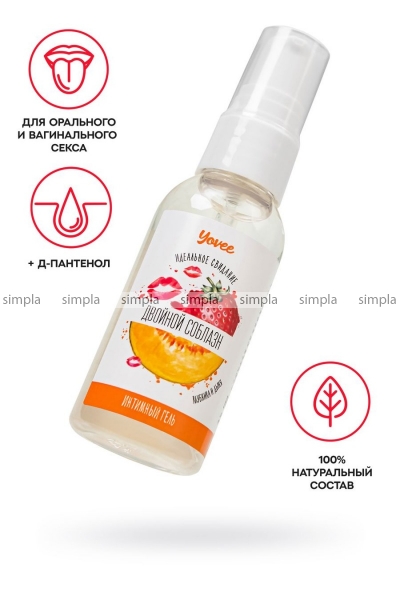 Интимный гель-смазка Yovee «Двойной соблазн» подарит комфорт и безупречное скольжение. Пантенол окажет успокаивающее и смягчающее действие, ускорит процессы регенерации слизистых. Волшебное сочетание вкусов и ароматов клубники и дыни усилят удовольствие. Подходит для использования как с презервативом, так и без него. Шелковистая текстура на водной основе обеспечивает длительное скольжение без липкости и скатывания. Легко смывается водой, не оставляет следов на одежде и постельном белье. Простой и безопасный состав: БЕЗ ГЛИЦЕРИНА БЕЗ ПАРАБЕНОВ БЕЗ КРАСИТЕЛЕЙ БЕЗ САХАРА