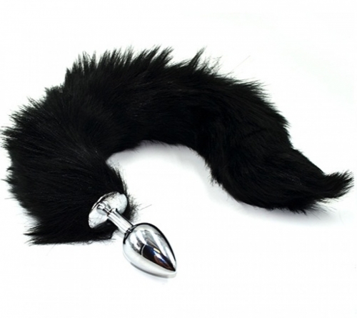 Серебряная анальная пробка с черным гибким хвостом (Small)