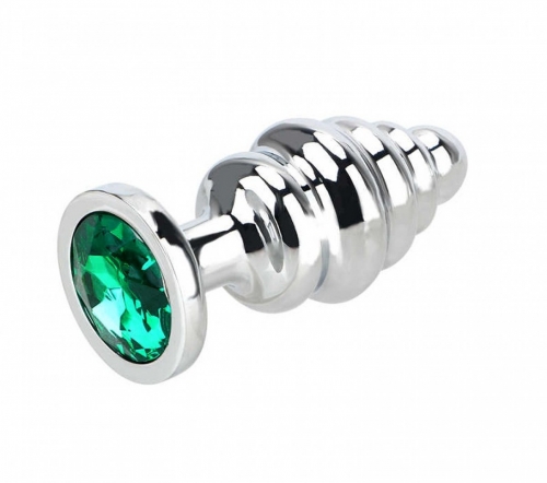 Серебряная ребристая анальная пробка с изумрудным кристаллом (Medium)