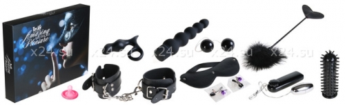 кожаные фиксаторы на руки, маска на глаза из кожи, стек, анальный стимулятор, вагинальные шарики со смещенным центром тяжести, вибратор, эрекционное вибрирующее кольцо, виброяйцо, насадка на пенис или на вибратор с "усиками", зажимы на соски, искусственные лепестки роз для создания романтической атмосферы