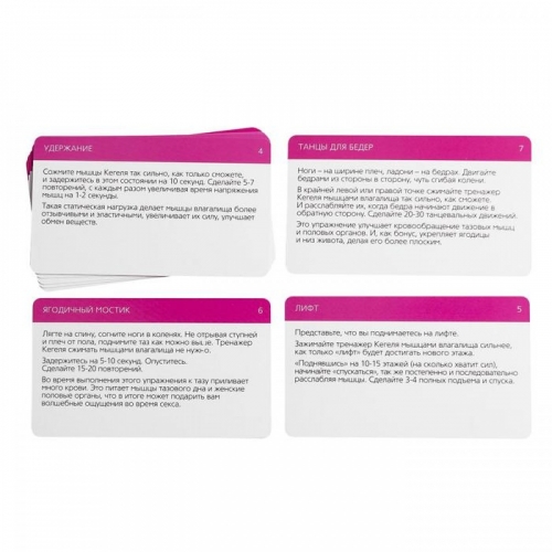 Этот набор поможет укрепить женское здоровье и подарит яркие эмоции. Просто вытягивайте карты из колоды в любом порядке и выполняйте упражнения. А затем наслаждайтесь новыми ощущениями вместе со своей половинкой.