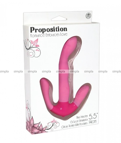 Настоящее тройное наслаждение всего от одной игрушки! Этот массажер обласкает все Ваши самые чувственные места одновременно! Он так хорош, что Вы на некоторое время забудете обо всем на свете, благодаря умопомрачительному оргазму! Клиторальный и вагинальный стимуляторы интенсивно вибрируют, воздействуя так, как невозможно при настоящем половом акте! Proposition - любовник из мира, где пересекаются реальность и фантазия! Настройка производится в основании фаллоимитатора при помощи всего 1 кнопки, что очень удобно. Материал, из которого изготовлен вибратор, приятный на ощупь, упругий и гладкий. Имеется 3 скоростных режима.