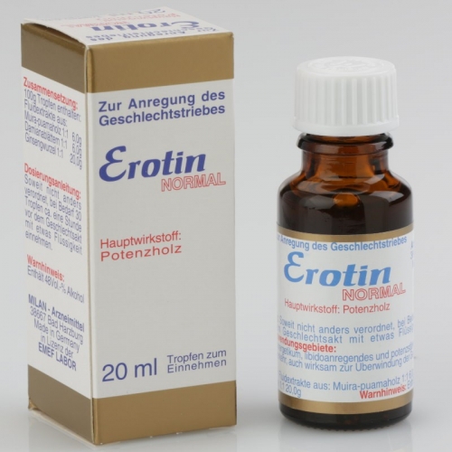 Возбудитель для пары Erotin Normal предназначен для повышения сексуального влечения у мужчин и женщин. В основе формулы лежат экстракты таких известных стимуляторов, как муира пуама и женьшень. Средство абсолютно натуральное и безопасное. Его добавляют в любой напиток без газа. Производитель рекомендует принять «коктейль» за 30-40 мин до секса. Эффект от использования заметен через 10-15 мин. У женщин начинает активно выделяться смазка, мужчины ощущают прилив энергии к половому органу.